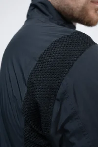 La capa exterior, completamente termosellada, está fabricada con la reconocida membrana eVent® DVstorm™, que actúa como una barrera impermeable y cortaviento, al tiempo que permite una óptima transpirabilidad y evacuación del sudor. En el interior, el aislamiento Polartec® Alpha® garantiza un confort térmico avanzado con una excelente capacidad de transpiración. Su diseño innovador combina fibras hidrofóbicas con un núcleo de malla sólida, promoviendo una circulación de aire activa. Es un tejido ligero, comprimible y altamente eficiente en la gestión de la humedad generada por el esfuerzo.