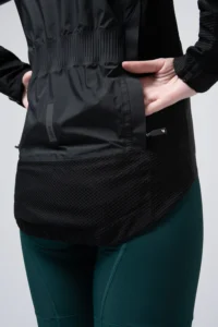 Para reforzar su resistencia al agua, la cremallera frontal utiliza el modelo Vislon® Aquaguard® de YKK, asegurando una total estanqueidad. Además, incorpora puños con cremallera y un cuello elevado para una protección superior, junto con dos amplias aperturas traseras con cremallera que permiten acceder fácilmente a los bolsillos interiores.